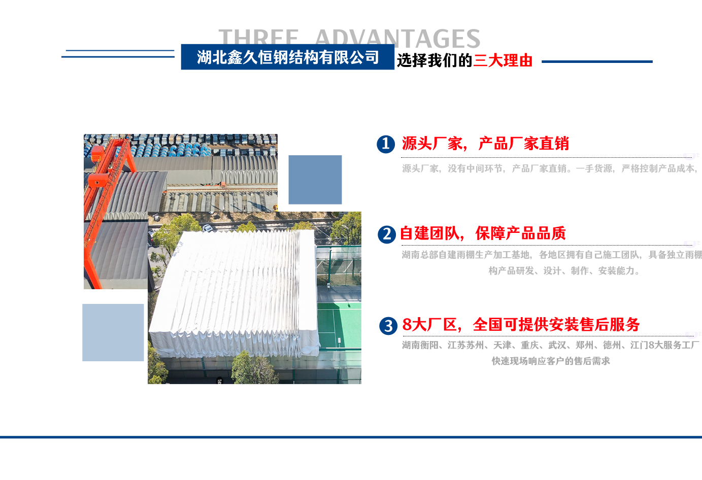 湖北鑫久恒鋼結構有限公司是一家電動雨棚、膜結構車棚研發(fā),生產銷售,施工安裝于一體的專業(yè)鋼結構科技公司,主要產品有伸縮雨棚,電動雨棚,膜結構車棚等。 湖南地區職員目前有80多人,占地面積20000平方米,廠房面積15600平方米,配備先進的生產流水線,使每件品質產品的堅實基礎。 公司在蘇州、天津、重慶、武漢、德州、烏魯木齊、江門均設有服務工廠,總人員共300多人,擁有專業(yè)的技術團隊,配備先進的設備和流水線生產,產能高,貨源充足,發(fā)貨速度快,服務區域廣。 移動伸縮棚適用于通道臨時倉儲、戶外運動遮陽、污水池遮蓋、能源交通、熱力化工、礦山、船舶制造及市政建設、物流、碼頭等領域的構件制作加工,成品半成品存放、倉庫、野外儀器設備操作用房等。尤其是對工廠發(fā)貨、倉儲臨時遮雨防嗮,梅雨期較長、建設周期較短的工程施工等特別適用。還可根據用戶需求量身定制、適合企業(yè)所需不同款式的產品。 我公司堅持“誠信社會為本,客戶滿意為榮”的經營理念,做到質量把控,嚴格管理,精益求精,恪守承諾。使鑫久恒逐步走向成熟,其系統化、專業(yè)化日趨完善。以專業(yè)的技術、科學的管理,更高的產品質量,優(yōu)良的企業(yè)信譽,真誠的客戶服務,靈活多樣的經營方式和務實創(chuàng)新的企業(yè)精神愿與社會各界攜手合作,為推動智能鋼結構建筑事業(yè)的發(fā)展而不斷努力。...